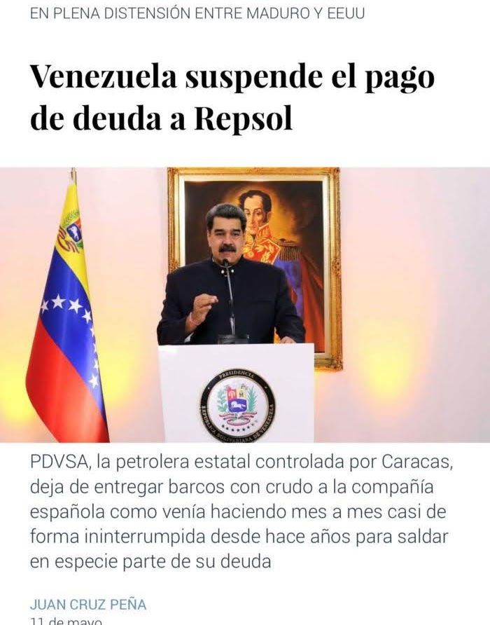 Venezuela ha suspendido el pago de deuda a Repsol. PDVSA, la petrolera estatal controlada por el Gobierno de Nicolás Maduro, venía realizando entregas de crudo como forma de saldar en especie parte de las deudas que arrastra con la multinacional española, reseñó Juan Cruz Peña en El Confidencial.
