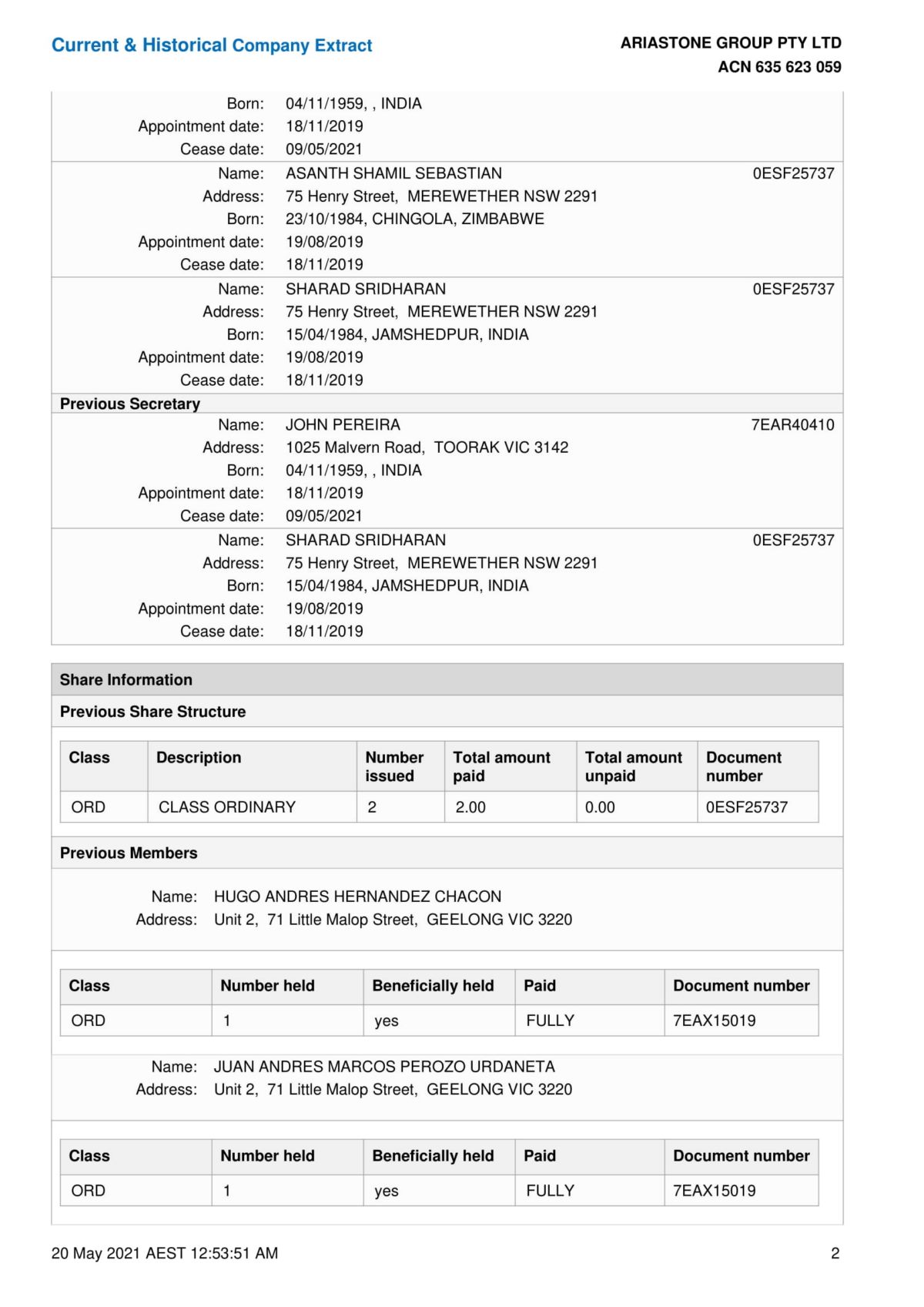 Según los documentos de la Comisión Australiana de Valores e Inversiones (Asic, por sus siglas en inglés) —ente encargado de regular los mercados y servicios financieros australianos—, Hernández Chacón y Perozo Urdaneta formaron parte de la empresa Ariastone Group Pty Ltd.