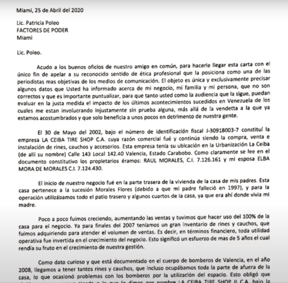 En sus denuncias, la periodista comentó acerca de dos tiendas propiedad de Raúl Del Gallego en Miami. Poleo recibió una carta con fecha de 25 de abril de 2020, suscrita por Raúl Morales, en un intento de ofrecer su versión en torno a hechos denunciados por la periodista. En la carta, Raúl Gerardo Morales Flores, como es su nombre completo, reconoció haber tenido una sociedad con Raúl Del Gallego, uno de los arrestados en Venezuela en operativos antidrogas contra el Cartel de Paraguaná. Morales aseguró que posteriormente la sociedad con Del Gallego fue supuestamente disuelta. No obstante, desde 2008, en la provincia de Carabobo, en Venezuela, era conocido que Raúl Del Gallego estaba involucrado en tráfico y contrabando de droga.