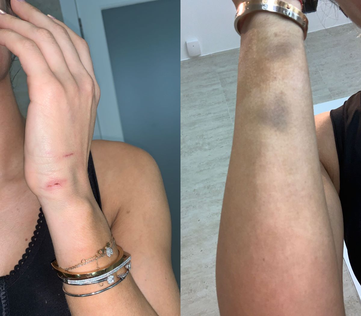 como víctima de agresiones por parte de la modelo, omitiendo detalles de la