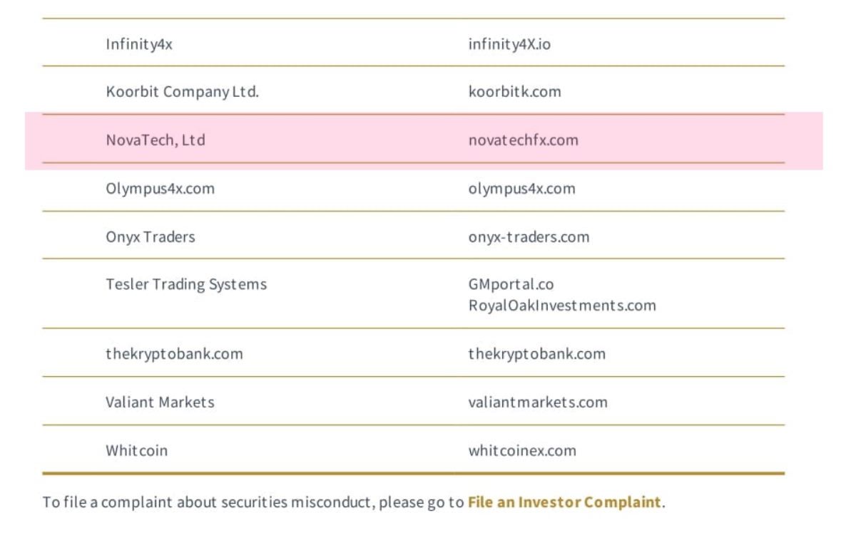 El 14 de octubre, la Comisión de Valores de Alberta (ASC) agregó NovaTech FX a su lista de advertencia de inversión.