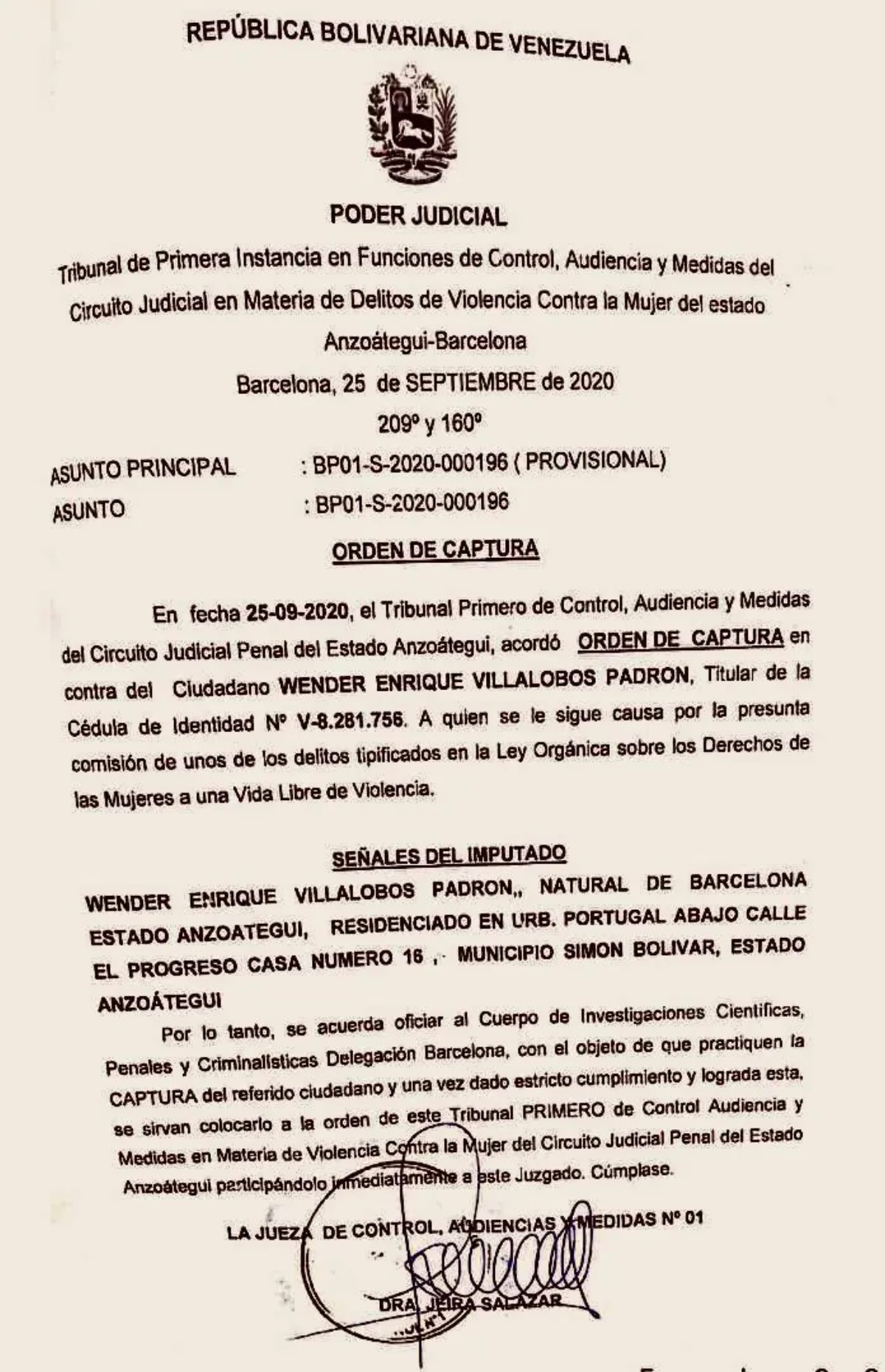 En fecha 25/09/2020 el Tribunal Primero de Control, Audiencias y Medidas de Violencia Contra la Mujer acordó orden de captura en contra del ciudadano Wender Enrique Villalobos Padrón CI: 8.281.756.