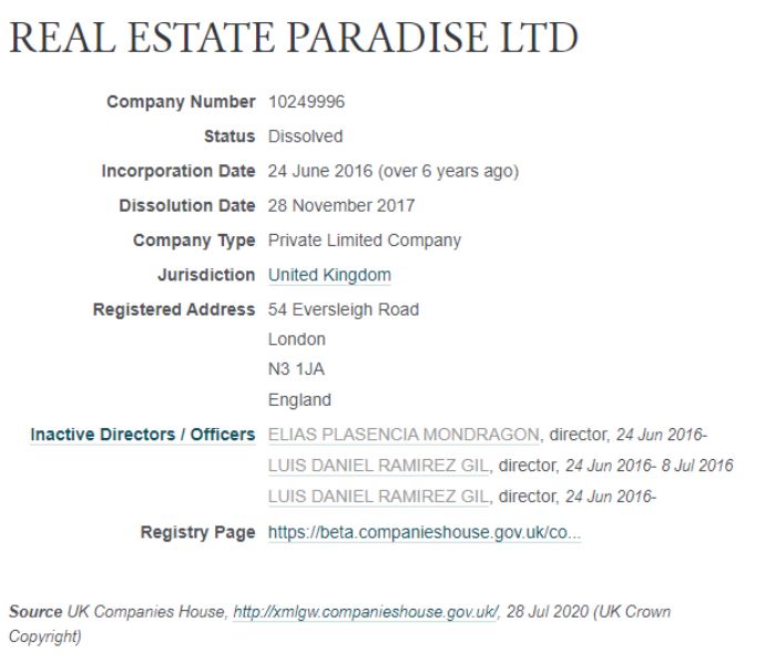 No obstante, otra compañía de la que Luis Daniel Ramírez Gil también es directivo, es de REAL ESTATE PARADISE LTD, misma registrada en el año 2016 en el Reino Unido y disuelta un año más tarde. El otro director de esa compañía es Elías Plasencia Mondragón, un fiscal militar venezolano que ha estado a cargo de acusaciones contra presos políticos en Venezuela.