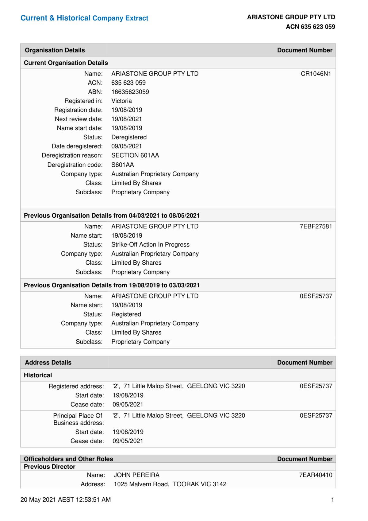 Hernández Chacón y Perozo Urdaneta formaron parte de la empresa Ariastone Group Pty Ltd, constituida en Australia en septiembre de 2019, ocho meses después de que Estados Unidos sancionara a la estatal Petróleos de Venezuela (Pdvsa) e impidiera al gobierno de Nicolás Maduro comercializar crudo y hacer operaciones financieras en la banca extranjera, reseñó El Publique.