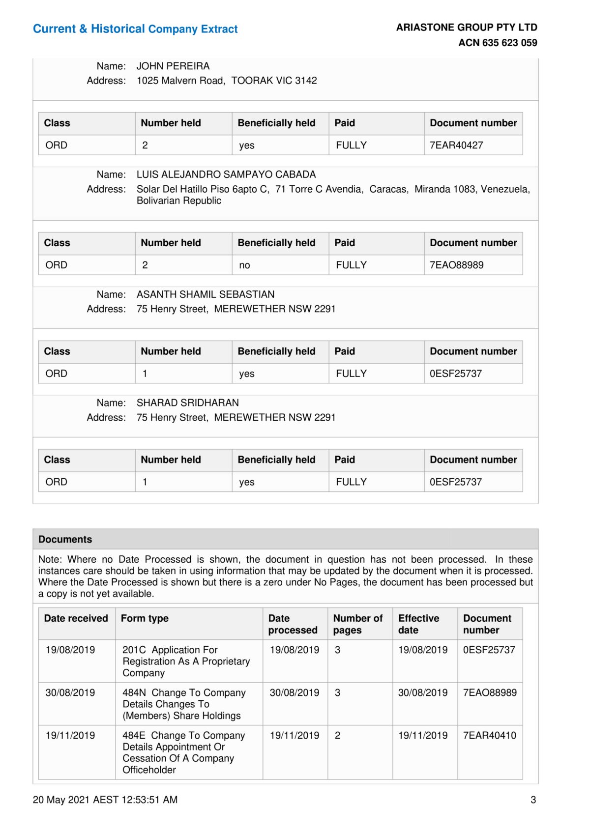 Los documentos mercantiles revelan que Hernández Chacón y Perozo Urdaneta compartieron el capital social de Ariastone Group Pty Ltd con otro venezolano llamado Luis Alejandro Sampayo Cabada, y con tres empresarios extranjeros: Jhon Pereira y Sharad Sridharan, ambos de la India, y Asanth Shamil Sebastian, oriundo de Zimbabue. De estos socios se consiguen pocos datos en internet.