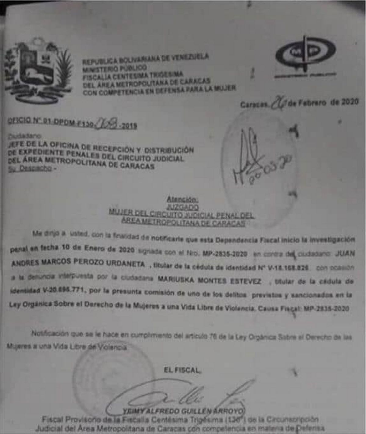 En un caso aparte, el ciudadano venezolano Juan Andrés Marcos Perozo Urdaneta, es investigado desde 2020 por delitos de maltrato a la mujer, por atentar contra Mariuska Montes Estévez. Es importante destacar que un documento filtrado en internet, indica sobre una investigación aunque, por ese hecho en particular Perozo Urdaneta no habría sido privado de libertad.