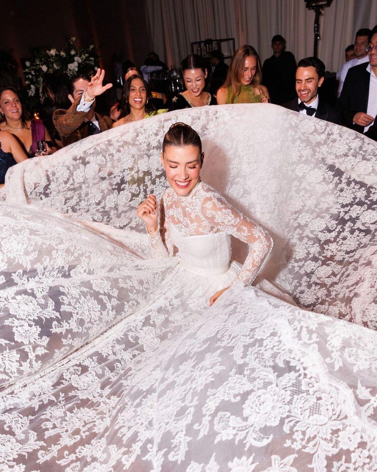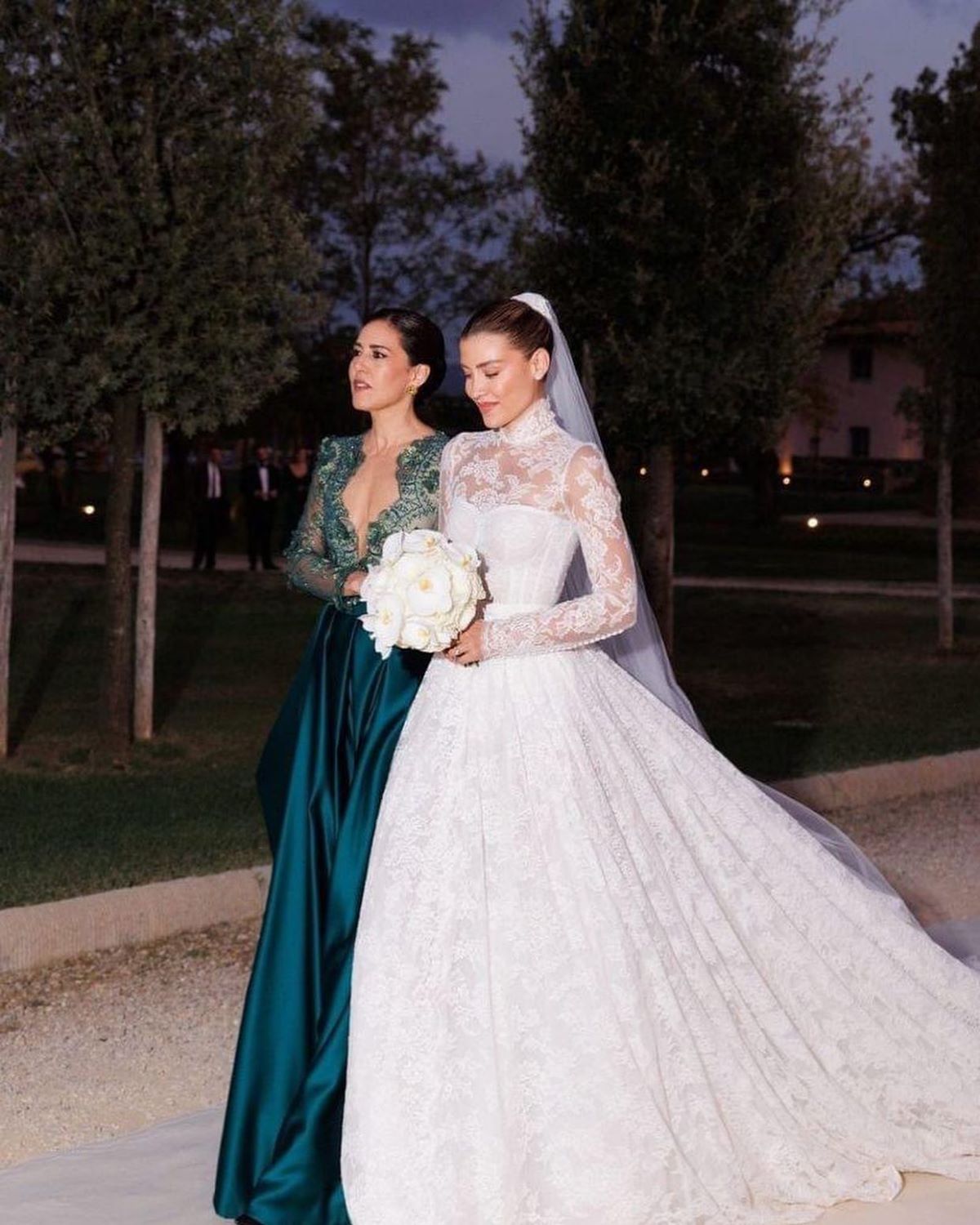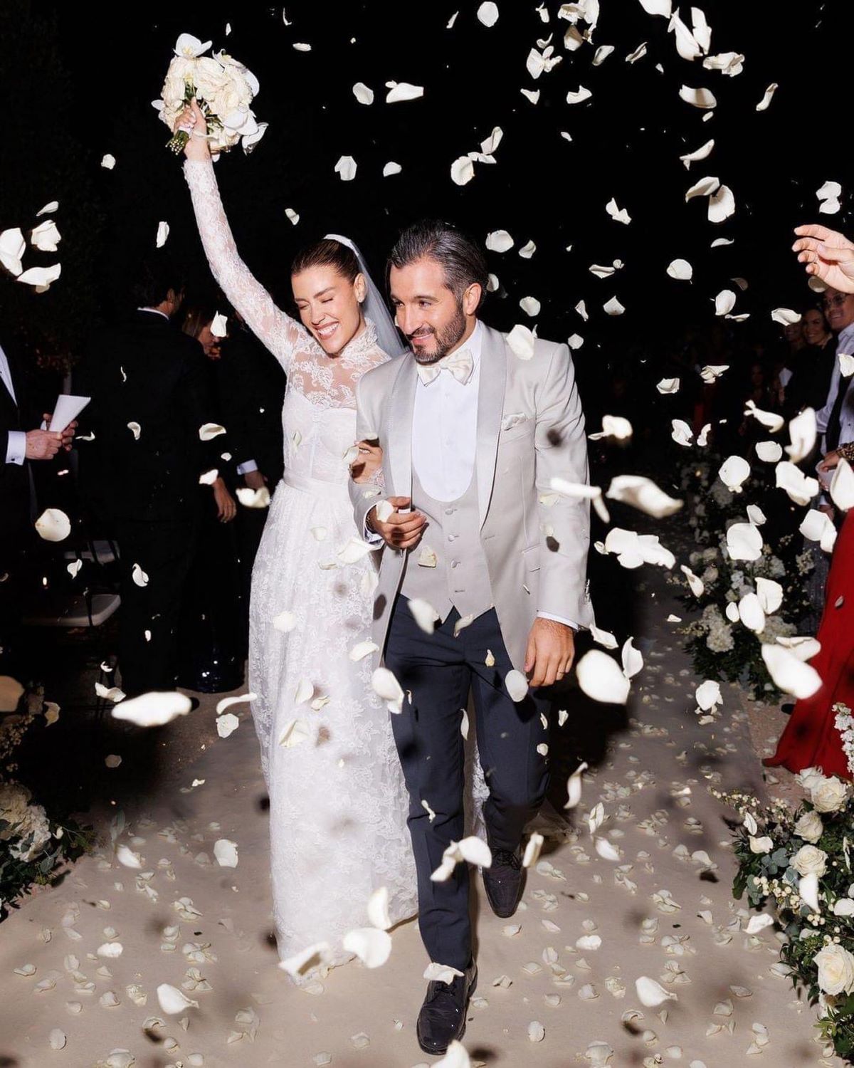 La novia, que es influencer y modelo, lució tres vestidos diferentes a lo largo de la velada, todos ellos de Dolce & Gabbana. El de la ceremonia fue un voluminoso vestido de novia con corte de princesa y una cola de más de dos metros de largo.