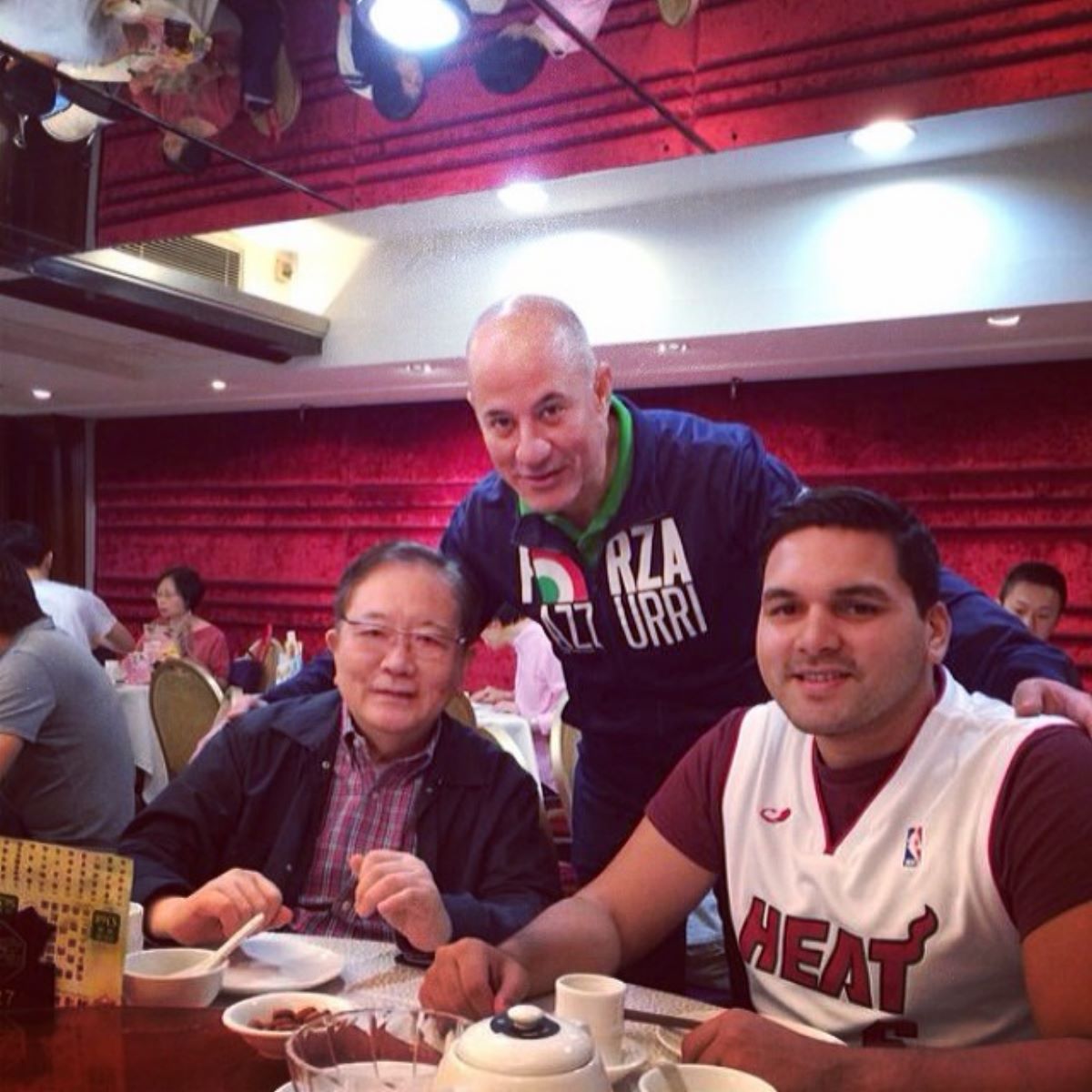 Oscar Patiño Torres (cen.) en China junto a Michael Chambra (de.), hijo del presidente de Traki, Antonio Chambra