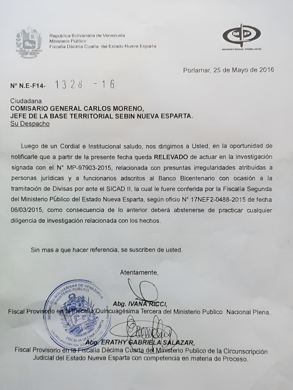 El 25 de mayo de 2016, las fiscales Ivana Ricci y Erathy Gabriela Salazar, 53 Nacional y 14 de Nueva Esparta, respectivamente, ordenaron al Comisario General Carlos Moreno, jefe del SEBIN en el estado Nueva Esparta, “abstenerse de practicar cualquier diligencia de investigación relacionada con los hechos”, en referencia a la investigación contra Samir Makiad El Fallah. En otras palabras, la fiscalía le pidió al SEBIN que dejara de investigar los delitos de los que se acusaba a Samir Makiad El Fallah y a su hermano.