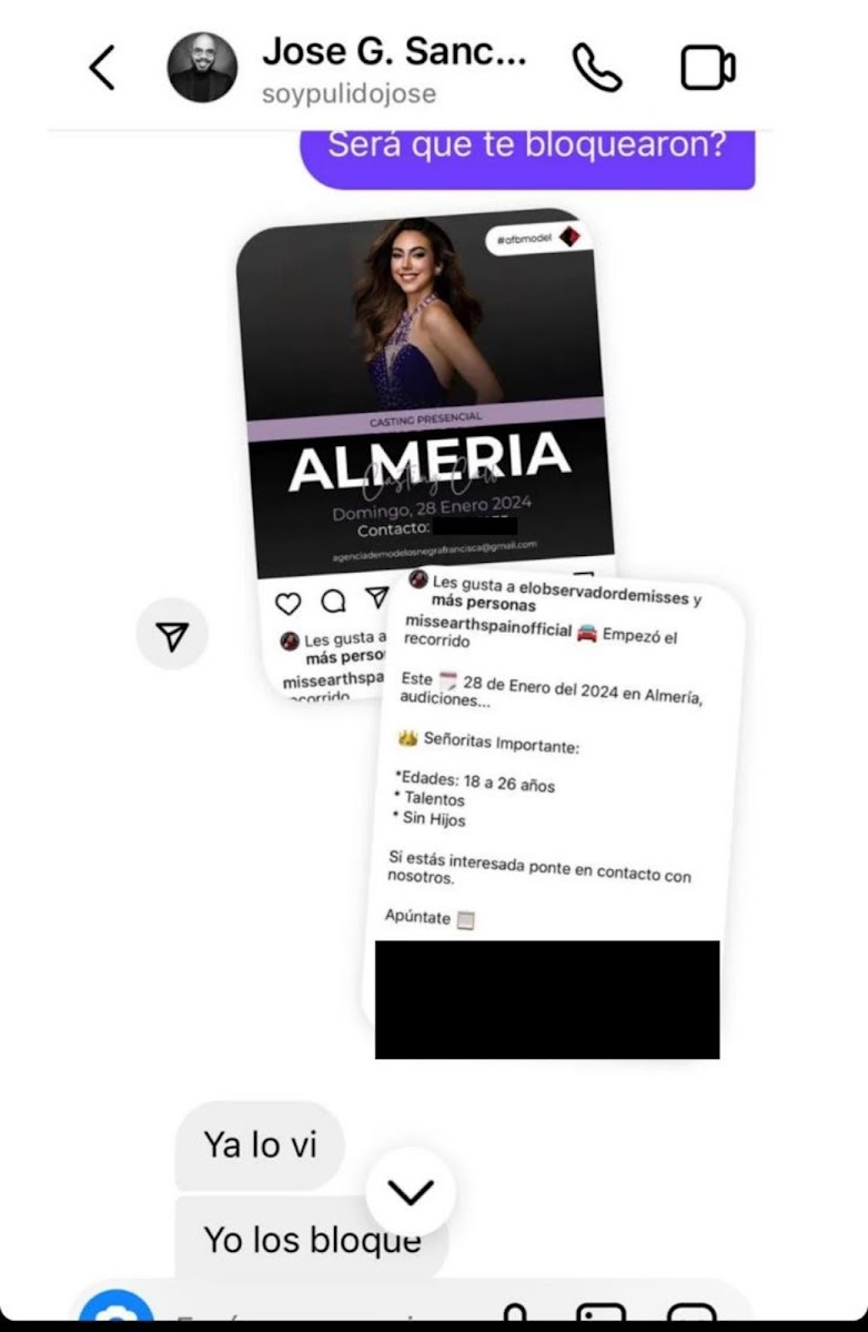 Ferraro contó que Sánchez Pulido la contactó a través del perfil de Instagram @soypulidojose y le propuso ser Miss Earth Spain 2024, con la condición de que debía adquirir la franquicia antes del 28 de ese mes. Además, le dijo que debía hacerse unas fotos profesionales para hacer oficial su designación.